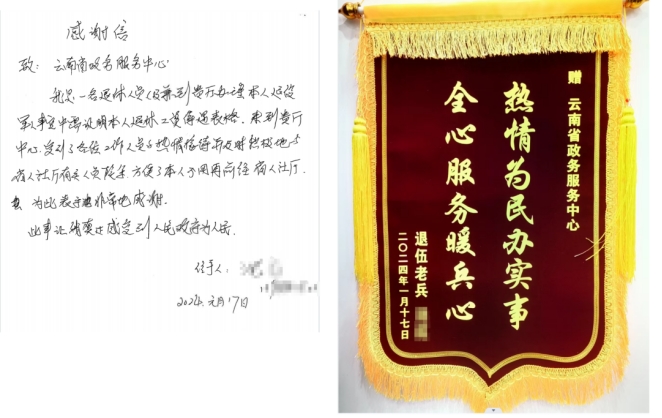 1月17日,云南省政務(wù)服務(wù)中心收到一封手寫感謝信和燙金錦旗?!盁崆闉槊褶k實(shí)事 全心服務(wù)暖兵心”幾個大字,是一位七旬老人的真心點(diǎn)贊。