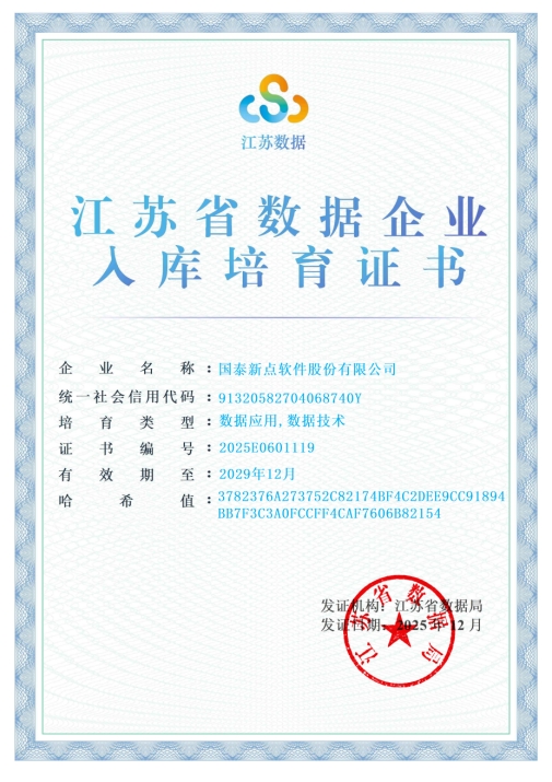 近日,江蘇省數(shù)據(jù)局正式發(fā)布江蘇省第一批入庫(kù)培育數(shù)據(jù)企業(yè)名單。經(jīng)過(guò)多輪嚴(yán)格篩選與綜合評(píng)審,新點(diǎn)軟件憑借在數(shù)據(jù)領(lǐng)域的深厚積累與綜合技術(shù)實(shí)力成功入選,獲評(píng)“數(shù)據(jù)應(yīng)用”“數(shù)據(jù)技術(shù)”培育資質(zhì),標(biāo)志著企業(yè)在數(shù)據(jù)創(chuàng)新與實(shí)踐方面獲得省級(jí)權(quán)威認(rèn)可。